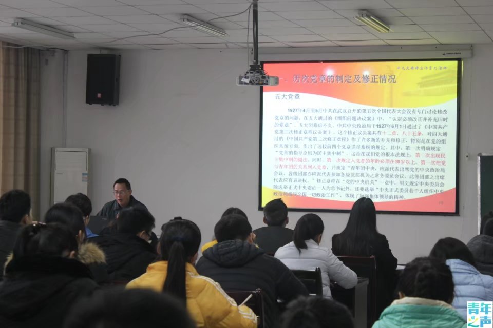 紧接着,唐书记一条一条地解读《中国共产党章程》新修订的章程。其中,中国共产党要领导全国各族人民实现社会主义现代化的宏伟目标,这一目标已改为“两个一百年”奋斗目标,实现中华民族伟大复兴的中国梦……教室座无虚席,同学们认真聆听,拿出笔记,记录重点。唐书记将一条条党章修订前后的具体内容展现给大家看,以便同学们比对并加深了解党章内容修改的目的与党的建设相关内容。