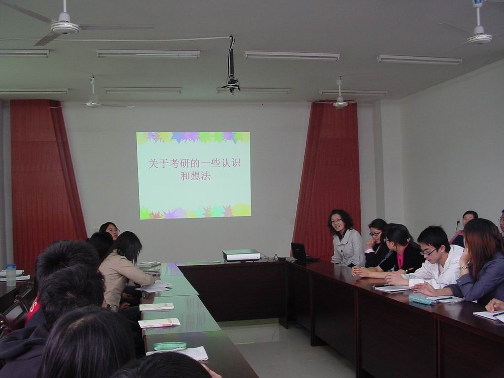 首先,黄坤林教授介绍了化学(师范)专业考研的相关情况,他以“2010考研知多少”为题,从考研目的、全国化学硕博授权点分布、研究生入学考试须知、如何备考四个方面进行了详细介绍。黄老师告诫大家要正确评估自己,明确目的,做到不患得患失、知已知彼、百战不殆。他幽默风趣的演讲博得了师生们的阵阵掌声。随后,曹静老师从科学教育专业考研的实际出发,介绍并分析了此专业的考研动态和硕士点分布。最后,在2009年考研取得优异成绩的三位05级的同学结合自身备考经验解答了师弟师妹们提出的种种问题和困惑。