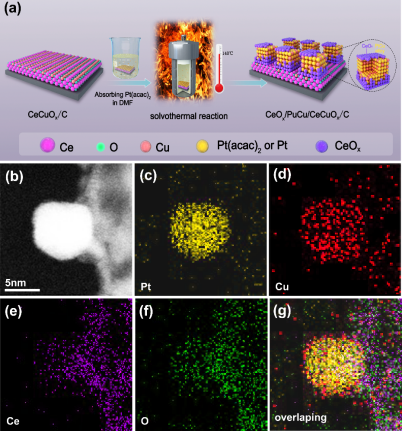 聂瑶老师等人首创性利用低温溶剂热反应成功在Pt-CeCuOx体系诱导产生强金属-载体相互作用(SMSI),一步实现Pt-Cu合金化及PtCu表面CeOx包覆,革新了Pt的相组成和催化构型。所制备的CeOx/PtCu/CeCuOx/C催化剂在酸性电解质中表现出增强的电催化MOR活性、耐CO中毒能力和长期稳定性。密度泛函理论(DFT)计算结果指出,PtCu合金相和CeOx包覆层的形成同时诱导产生了压缩应变效应、配体效应(从Cu到Pt的电荷转移)和强Pt-CeOx电子相互作用;这些效应和电子作用的耦合使的CeOx/PtCu/CeCuOx/C中的Pt具有更多的缺电子特征和下移的d带中心,从而从本质上削弱了*CO的吸附能,有效地提高了其MOR活性和抗中毒能力。此外,CeOx的存在增强了*OH在CeOx/PtCu界面上的吸附,最大程度地减少了*CO对相邻Pt活性位点的阻塞。