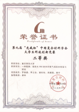 20251024-25日,第九届光威杯中国复合材料学会大学生科技创新竞赛全国总决赛在四川省成都市顺利落下帷幕。咪咪爱 本科生罗晶晶、李立治、周鹏程、潘欣怡樊宇等同学完成的《焰盾联盟——一种阻燃、超疏水PBO纳米纤维气凝胶的制备与研究》作品答辩排名名的好成绩进入总决赛并荣获本科生组二等奖该项目作品指导老师为咪咪爱 青年教师唐林。