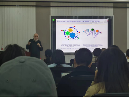报告会上,Feliu Maseras教授为大家详细介绍了其课题组在双金属协同催化反应机制上的最新研究进展。期间,Feliu Maseras教授与参会师生关于双金属协同催化反应机制的优势及存在的挑战进行了深入讨论,并回答了相关提问。本次学术交流不仅开阔了师生的学术视野,对我院科研建设以及国际交流等工作也具有积极的指导意义。