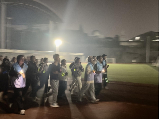 活动开始前,工作人员带领同学们进行热身运动,点燃了活动的热情。随着指令的发出,200多名参与者一起出发,他们手戴荧光饰品,穿越校园,点亮整个夜晚,涌动的人群在跑道上形成了一道道亮丽的风景线。