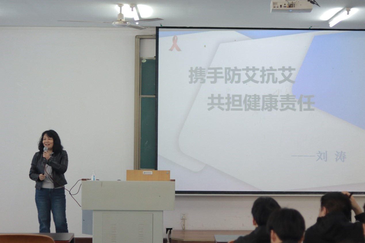 讲座开始之前,刘涛老师先让同学们做了几道有关于艾滋病知识的题目,目的在于了解青年学生对艾滋病的知识和行为状況。在此之后,讲座正式开始,刘涛老师从学生艾滋病案例分享、艾滋病的危害、艾滋病疫情概况和如何预防艾滋病感染四个方面展开讲述。