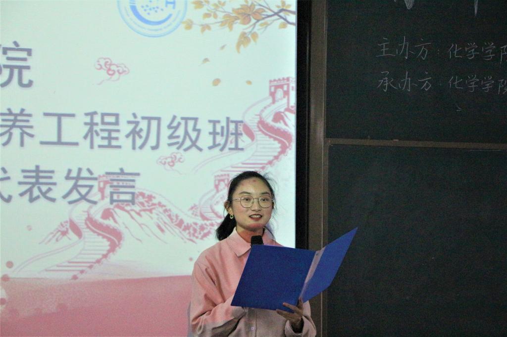 青马班的发展历程,让各位同学更加了解青马班。接下来,于斌老师为第十二期的九位优秀学员颁发奖状。随后第十二期青马班优秀学员代表陈雨上台发言,并讲述自己在青马班的心得感悟。她讲到进入青马班是一次难得的学习交流、锻炼和提高的机会,希望新学员能在此过程中把握机会,明确目标;提高认识,严守纪律,遵守各项制度;学以致用,理论联系实际,提高工作效能。