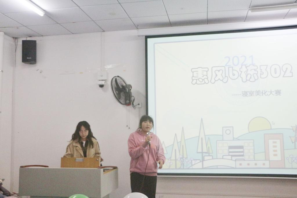 活动在主持人张佳静、刘吴颖的宣布下正式开始,各参赛寝室通过演示ppt、播放视频以及现场解说等多种方式结合,来展示自己寝室的风采,介绍寝室布置的细节、理念以及寝室公约、寝室目标。其中让人印象深刻的是惠风B320“简朴寨”寝室,幽默轻松的解说搭配上独具特色的寝室风格,让评委们纷纷打出高分,获得了此次比赛的一等奖!其他寝室也是各出奇招,精心制作的小视频、快闪等都让人眼前一亮。