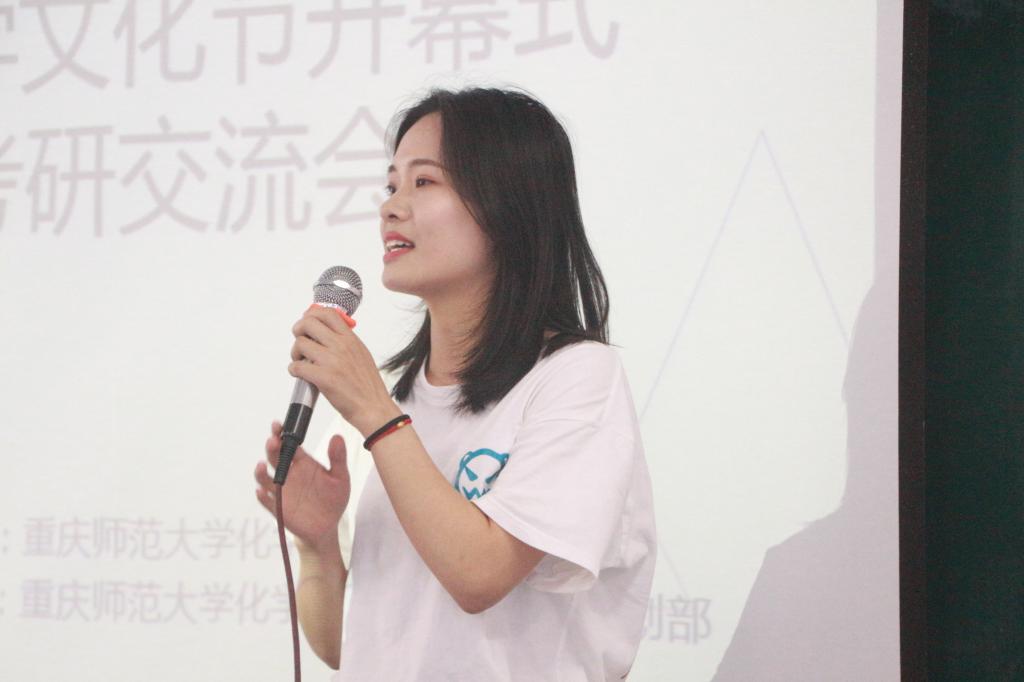 第六届“魅力化学”文化节正式开幕。紧接着是考研交流会。本次邀请到了七位2017级成功上岸的学姐为有考研意向的同学分享考研备考、笔试和面试等的相关经验。首先是张静、李泓宇的分享,她们的报考志愿都是兰州大学,并分享了有关专业课备考方面的独到见解,让同学们对考研准备阶段有所认识;接下来是被南开大学录取的谭鑫,她分享了自己争取一切可能性的艰辛历程;陈雪杉、刘莉志愿于四川大学,她们强调了考研科目中,政治、英语的重要地位,并提醒到要从现在开始积累相关知识;李昭螢分享了她志愿取舍的历程,并且现已被哈尔滨工业大学正式录取;最后是报考西南大学的彭晓格的分享,她告诉同学们“早做好决定,比什么都重要”。