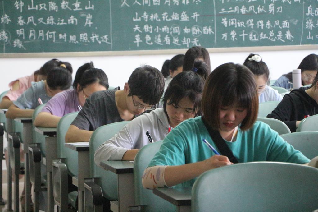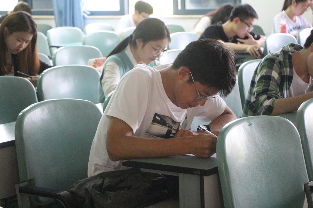 竞赛正式开始前,由监考员强调考试纪律以及相关注意事项,并分发试卷。两点答题准时开始,每位同学都全神贯注,认真的思考着题目,整个考场只余“沙沙沙”的落笔声。另外三位监考员分别站立于教室的其余三个角落,确保各位考生答题的独立性。随着答题进程加快,陆续有同学交卷离开。一小时后,竞赛正式结束,所有同学都交卷离场。
