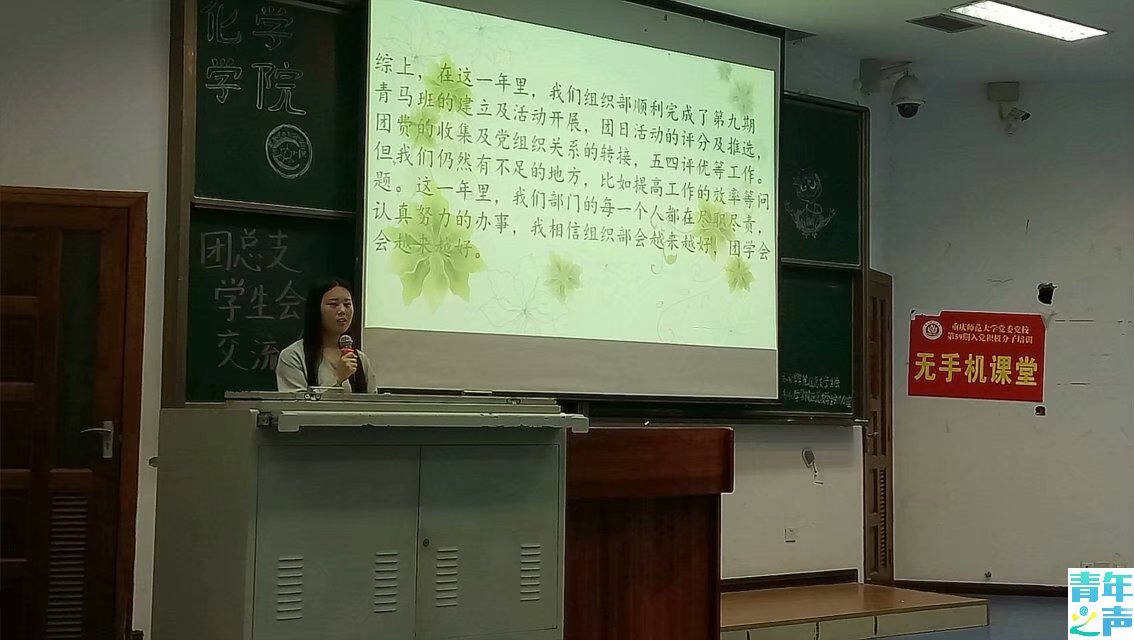 咪咪爱 团总支学生会全体成员在这个大家庭工作了快一年了,在这忙碌的一年里,学生会的工作有许多精彩的瞬间,也存在着遗憾和不足。为使今后团总支学生会的工作开展得更加顺利,2018年5月18日,由咪咪爱 团总支学生会主办,咪咪爱 团总支学生会办公室承办的“2017—2018届团总支学生会交流会”于晚上7时在弘德楼15205举办,李文、宋龙吟主持。出席此次交流会的嘉宾有团学会主席唐喜、办公室主任秦佳莹、组织部部长蒋皓、实践部部长周莆、体育部部长葛琦、宣传部部长耿立珊。
