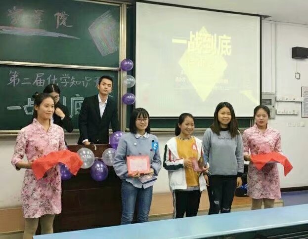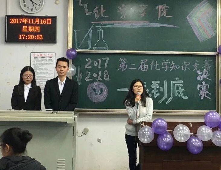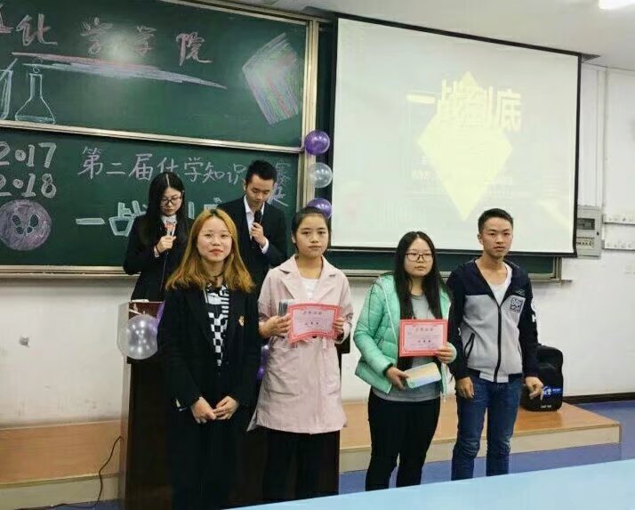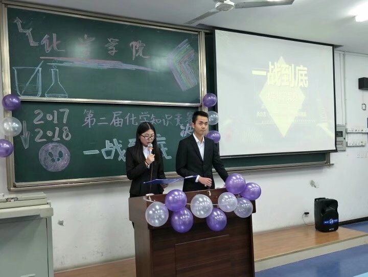 2017、2018第二届化学知识竞赛"一站到底"决赛,本次活动的嘉宾是16级辅导员陈霞老师,学生会主席唐喜,书记白艺莲;评委是第一届一站到底一等奖获得者赵松、三等奖获得者耿立珊。经过了"一站到底"的初赛,一共有十位同学进入了"一站到底"总决赛。 此次比赛的主持人为李康、王晓慧。