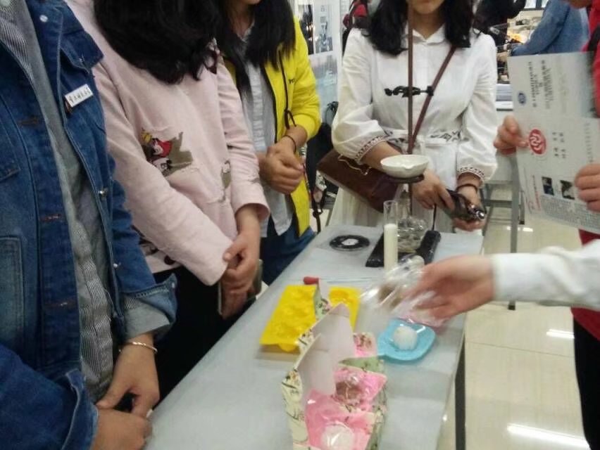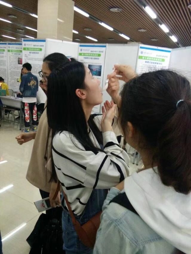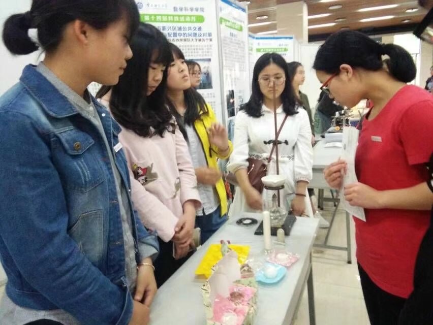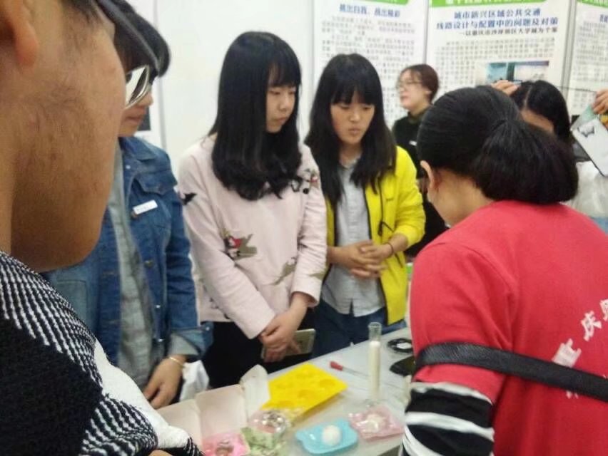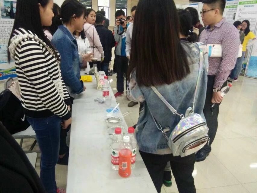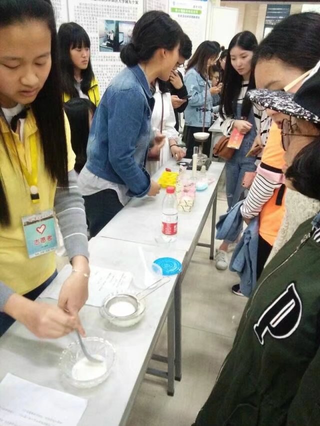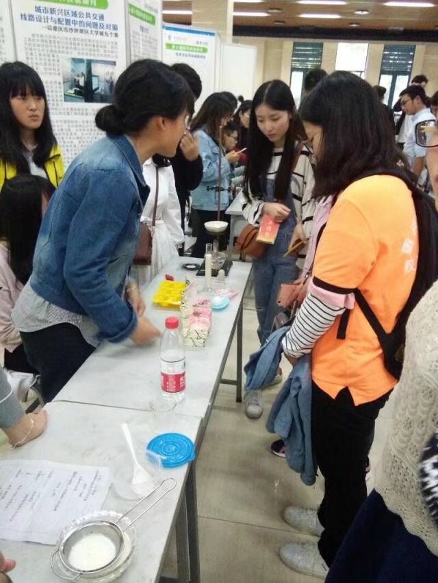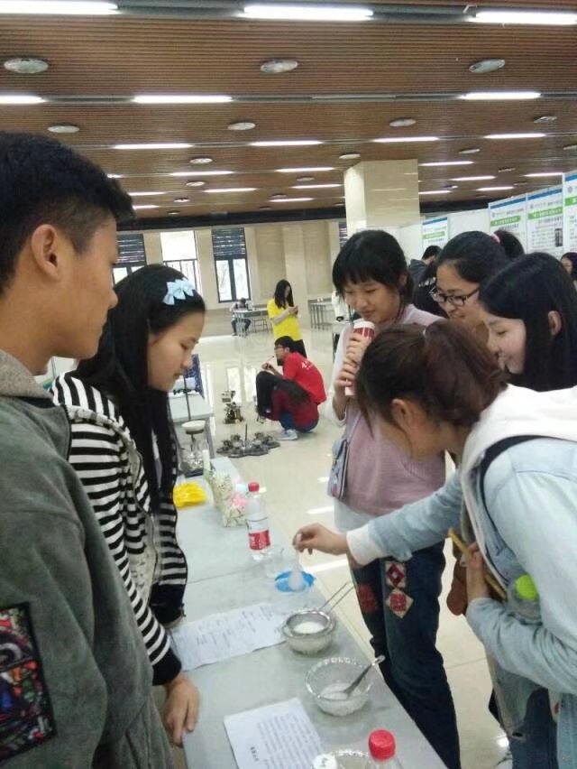 同学们都带着渴望的眼神来了解各种东西的制作方法,讲解的同学也很积极的为大家讲解。其中对于制作分子美食的印象比较深刻,因为现场制作出的分子美食就像一颗颗的鱼子一样,而且还可以食用,开始的时候,同学们带着怀疑的眼光认为这不能吃。其实他是利用海藻酸盐和钙离子发生胶凝反应的这一特性,分子美食家们创造出了众多有创意的美食,所以是可以食用的,当同学们品尝一点之后,都纷纷表示不错。紧接着,有学校的领导也到现场来观看,讲解的同学也为来观看的领导讲解其展品的相关原理。
