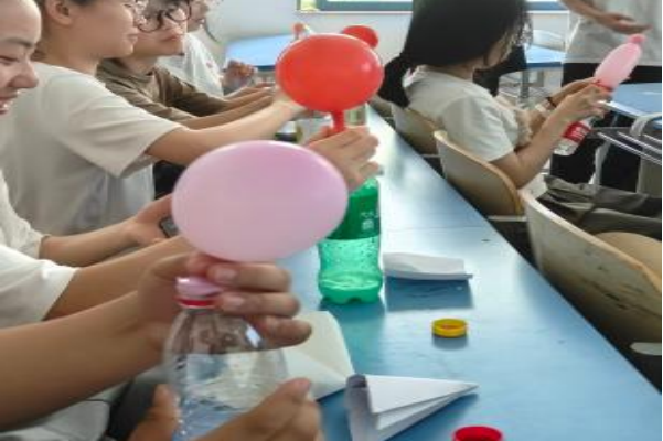 听完了主持人的讲解后,大家都跃跃欲试,迫不及待想要上手操作。其余工作人员协助同学进行实验操作:往瓶子里加一些白醋,往气球里再倒入一点小苏打,将气球套在瓶口,放下小苏打。