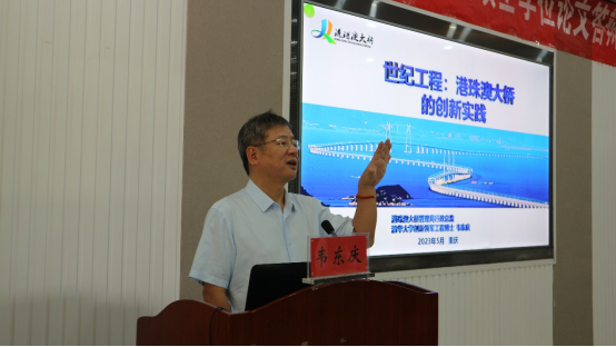 “2010年8月13日,正式上任,直到建成、通车,一共 2993天,8年零2个月。”在对港珠澳大桥背后的故事的讲述中,韦东庆告诉学弟学妹们,“考验的不仅是能力也是意志和耐力,需要坚定必胜的信念,需要一气呵成,不能掉队。”同时,结合这一“世纪工程,”韦东庆从国家视角出发,向在座的学弟学妹们介绍了在“一国两制”方针下的三地共建共管策略是什么?怎么做;从粤港澳大湾区建设与发展出发,通过对港珠澳大桥周边地区的人文地理进行介绍,引导学生们应用全视角、大图像思维去理解和认识港珠澳大桥,理解和认识这一“世纪工程”和工程背后的“大国匠心”。面对学弟学妹,他还激励同学们不管是学习还是工作,都要向榜样学习,要在前辈铺就的成功道路上继续奋力前行。