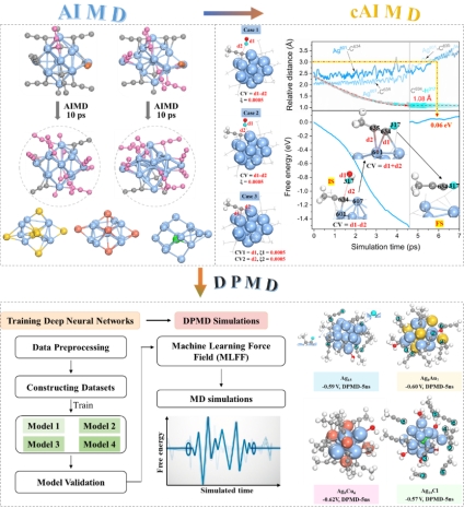 原子精确的银纳米团簇作为新兴电催化剂,在CO2还原等反应中展现出高活性和选择性,但其电化学工况下的动态结构演化机制尚不明确。传统实验表征难以解析原子尺度动态行为,而从头算分子动力学(AIMD)受限于皮秒级模拟尺度,无法捕获长程演化过程。为此,作者通过整合多尺度模拟(恒电势AIMD、约束性AIMD及深度势能分子动力学),首次揭示Ag15团簇及其掺杂体系(Ag8Au7/ Ag9Cu6/Ag14Cl)的电化学动态稳定性规律:所有团簇内核均从八面体向无序结构转变,表面炔基配体发生部分键断裂或全完整裂解;掺杂原子通过调控脱附路径显著影响稳定性,其中Ag₉Cu₆团簇因强Cu-C键显著抑制解离。基于机器学习力场(MLFF)的纳秒级DPMD模拟进一步证实,表面炔基配体解离数量(Ag15:4个、Ag8Au7:6个、Ag14Cl:8个)和内核无序化程度与掺杂类型相关,且≥2000 ps的长时程模拟是捕获动态稳定性的关键。该研究突破了AIMD尺度限制,实现了纳秒级近DFT精度的动态解析,为理性设计高稳定性银基团簇催化剂提供了原子级机制与理论研究新范式。