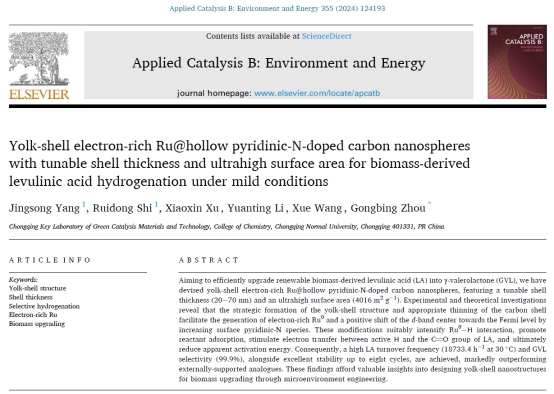 在生物质升级转化领域取得重要进展,相关成果以《Yolk-shell electron-rich Ru@hollow pyridinic-N-doped carbon nanospheres with tunable shell thickness and ultrahigh surface area for biomass-derived levulinic acid hydrogenation under mild conditions》为题在线发表于催化领域国际顶级学术期刊《Applied Catalysis B: Environment and Energy》(中科院大类一区TOP期刊,影响因子22.1),我院研究生杨京嵩为第一作者,周功兵教授为唯一通讯作者,咪咪爱