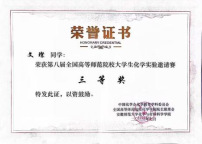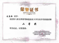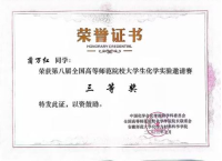 首次参与本项赛事,在学院领导和指导教师的关心帮助下,学生用心筹备,力争能在比赛中发挥出最好的水平,取得好成绩。本次比赛分为实验操作和笔试两个环节。其中,实验操作部分,同学们需要在规定时间内完成一系列化学实验,分为无机和分析实验、有机和分析实验、物理化学实验三个科目,每位同学随机抽取一个科目进行比赛;笔试主要涉及中学实验操作,以及四大化学实验中的重要知识。经两天的激烈比拼,我院参赛选手刘春梅同学获得二等奖、文璨和蒲万红两位同学获得三等奖。