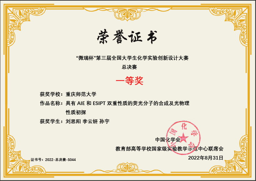 2020级学生刘思阳、李云妍和孙宇的参赛作品《具有AIE和ESIPT双重性质的荧光分子的合成及光物理性质初探》(指导老师:张岩副教授)在全国410所高校、908支参赛队伍中脱颖而出,在总决赛中荣获全国一等奖,实现了咪咪爱
