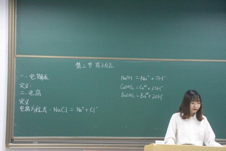 比赛伊始,一号选手王倩从微观和宏观两个角度解释了电解质的电离。她从生活中湿手触电的现象切入本次试讲的课程,然后又详细地讲解了电解质以及非电解质的定义。二号选手王路曦以酒驾为例引入主题,从乙醇的结构出发,详尽地讲述了乙醇的化学性质。九号选手包洪旭对乙醇不同的理解,让现在的观众和同学们富有诗情画意地感受到了乙醇在诗中的那一份情调。压轴出场的唐霜霜对于原电池有着深刻的认识以及理解,并且通过实验现象来详细地阐述了原电池的原理。