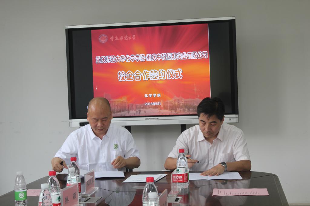 最后,付文升院长与重庆中科振邦实业有限公司董事长熊昉顺利地进行了校企合作签约仪式。校企合作的形式为化院学生学习提供了更加丰富的资源,为新创建的高分子专业提供更多的实践经验,也为咪咪爱