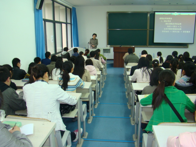 首先,郝教授向同学们介绍了科学教育课程改革的国际国内背景。接着,郝教授又通过丰富的案例和生动的演示向同学们讲述了行为主义、信息加工、建构主义等学习理论以及它们对科学课程与教学的重要影响。同时,她还对“脆弱知识综合症”、“科学探究”等概念进行了深入的剖析。另外,郝教授还对我国科学教育的未来发展前景作了美好的憧憬,鼓励作为科学教育专业开拓者的我们,要勇敢面对各种困难和挑战。郝教授生动诙谐的演讲赢得在场师生们的阵阵掌声。