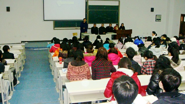 邀请六位一线名师在17201教师为08级同学举办了一场经验交流会,许应华老师担任本次交流会的主持,曹书梅老师也出席了会议。