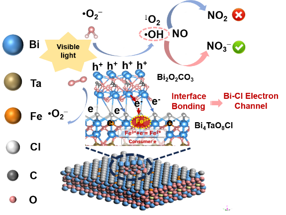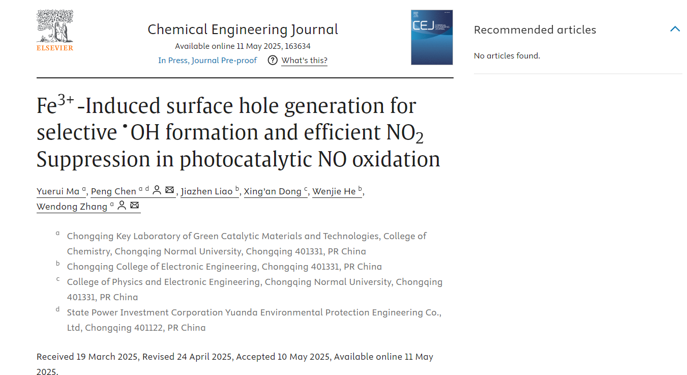 近日,咪咪爱 咪咪爱 科研团队在国际高水平期刊《Chemical Engineering Journal》(SCI一区TOP,IF=13.4)在线发表了题为“Fe3+-Induced Surface Hole Generation for SelectiveOH Formation and Efficient NO2Suppression in Photocatalytic NO Oxidation”的研究论文,咪咪爱 硕士研究生马悦芮为第一作者、陈鹏副教授和张文东研究员为通讯作者。