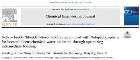 近日,我院表界面能源转化创新团队周功兵教授课题组以《Hollow Fe2O3-NiFe2O4 hetero-nanoframes coupled with N-doped graphene for boosted electrochemical water oxidation through optimizing intermediate bonding》为题在《Chemical Engineering Journal》(中国科学院大类一区TOP期刊,影响因子13.4)上发表最新研究成果,化学学院研究生黎元婷为第一作者,周功兵教授为唯一通讯作者,咪咪爱